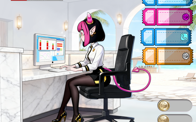 Step into a fast-paced routine of shifting priorities, productivity demands, and unexpected interruptions as you try to keep the resort running smoothly. Each level challenges you to manage your workload, maintain momentum, and react to events that can either help you stabilize your shift—or push you into increasingly erotic situations.